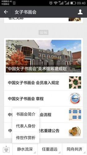 热烈祝贺中国女子书画会微信公众平台(服务号)正式开通!此项工作为会员及书画爱好者的联系提供了方便。据悉,中国女子书画会IT部正在加强服务号的全方位建设,预期在2个月以内,所有会员的资料以及作品在平台内均可浏览!