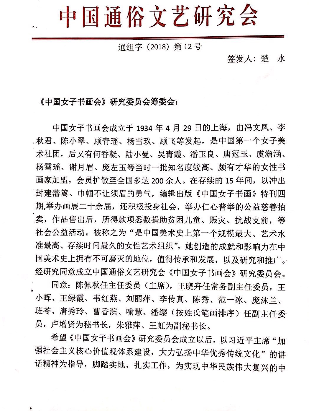(《中国女子书画会》研究委员会批文)