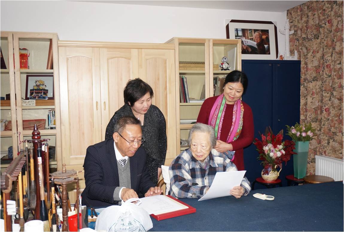 (图为中国女子书画会董事局和秘书处领导向陈佩秋先生颁发聘书并汇报工作 2017年12月20日摄)
