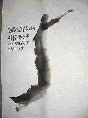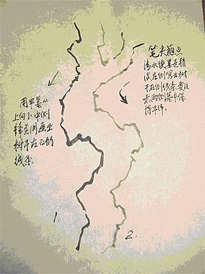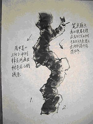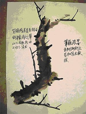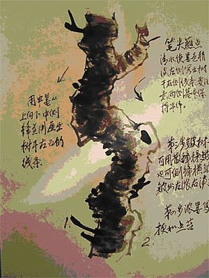 (1) 老干没骨法画法,实际上是挥写出来的。用较大的毛笔,先调淡墨至笔根,再调中墨至笔肚,最后再在笔尖上蘸浓墨在盘中稍调几下,使笔中浓淡墨浑然结合成三种黑色。入纸要侧锋卧笔,由上而下或由下而上运笔,大胆果断,有快有慢,有顿有挫,一气呵成画出老干浓淡雄健之气。