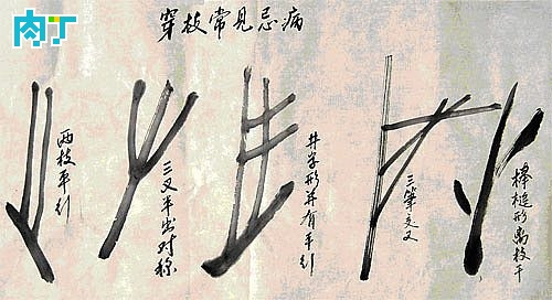 初学者在画梅树枝梗时,会画出各种违背树枝生长规律的忌病来,最多见的有三叉平头、鼓架形、三角形、井字形以及菱形、90度等几何图形。