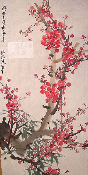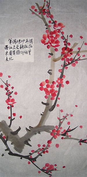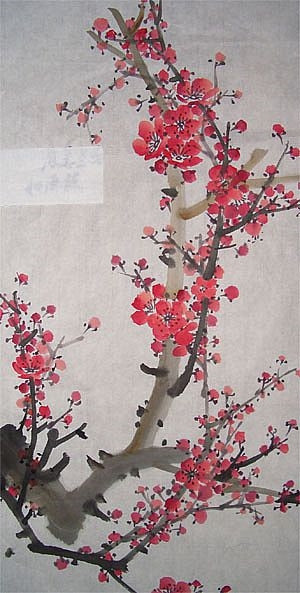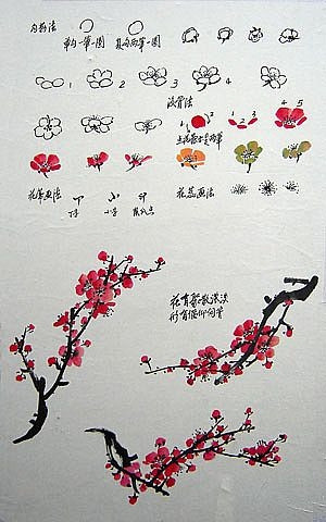 梅花原产我国,全国有两百多种。花瓣呈圆形,有单瓣复瓣两种,单瓣五出,亦有四出和六出的。国画在写意画中多画单瓣五出形。花的颜色有深红、浅红,白、绿、黄等等。画梅花表现的手法极为丰富,基本画法为勾勒法和没骨法两种。