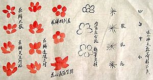 多用于点厾有颜色的花朵,以红梅为例,朱砂加曙红,大红加曙红或曙红加胭脂都可以。具体方法,用大白云笔蘸朱砂色,笔尖含色浓,笔根含色淡,再在笔尖上蘸少许曙红或胭脂,稍加调和即可点厾,花瓣或花蕾虽是圆点,也要两笔旋转成形。花形变化如同勾勒法,要分正面花、正侧面花、背面花、上仰花、半开花和花蕾等。
