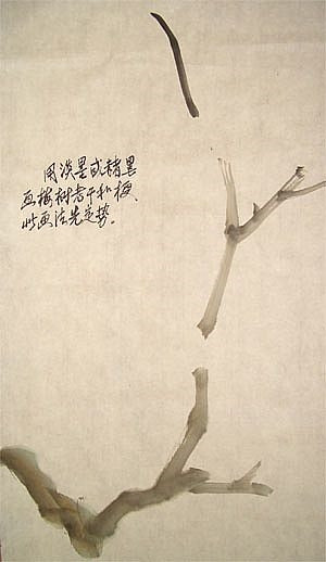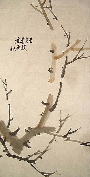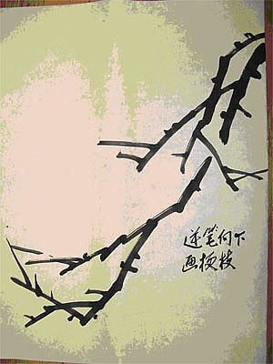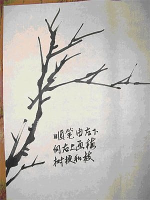 (1) 画枝笔蘸浓墨,墨色要比梗和老干深。起笔应藏锋,行笔要稳健,收笔有回锋。行笔在稳健流畅之中应有顿挫和转锋动作,使枝梗表现出木质节痕。细枝要柔中带刚,垂如钓竿,仰若盘弓。