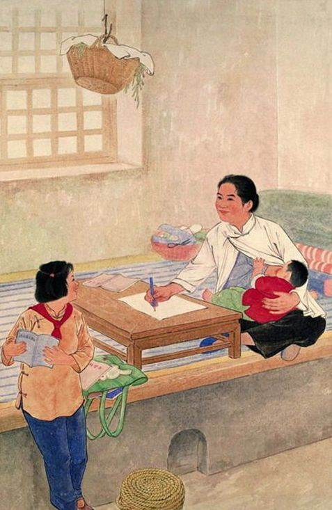 『考考妈妈』(中国画,1953年姜燕作),这件作品较早地注意到新政权诞生后,妇女的日常生活所发生的变化,共产党政府决心要改变上千年来妇女“目不识 丁”的状况,号召妇女学文化,作有文化的公民,这件作品正是借助女儿教妈妈识字的情节来反映新政权为提高妇女文化水准所作的努力。