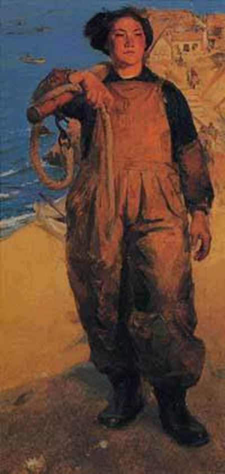 『海岛姑娘』(油画,1961年王霞作),这件作品很典型地反映了毛泽东时代所形成的一种审美趣味,画中那个纯朴健壮的劳动妇女形象正是新的时代所要求的 “能顶半边天”的女性形象。以她们如男人一样健康结实的体魄,来与以往那种弱不经风的“资产阶级小姐”形象相区别,这种审美趣味进一步膨胀,便是对所有柔 美的事物取彻底否定的态度,便是“文革”中那种虚假的“红、光、亮”形象的出现。