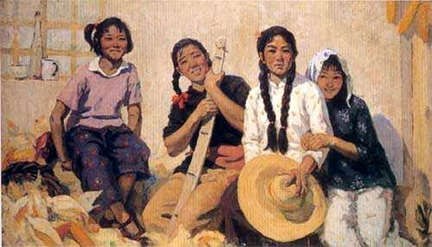 『四个姑娘』(油画,1962年温葆作),这件作品与『海岛姑娘』不同之处在于它刻划了四个性格不同的女孩形象:一个腼腆,一个温厚,一个俏皮,但她们还 算不得作品的真正主角,画中那位人高马大、粗壮有力的成熟青年女性才是真正的中心人物,她与“海岛姑娘”一样,一看即知是一个不会向男人示弱的劳动能手, 是完全符合毛时代审美标准的女性形象,也是其余三位程度不同地带有女性气的可爱女孩的学习榜样。